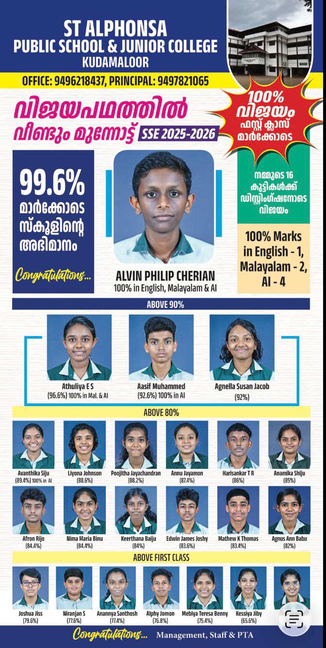 St Alphonsa Public School & Junior College, Kudamaloor, nurtures academic excellence and moral integrity, shaping future leaders with a strong foundation in knowledge, discipline, and holistic development.